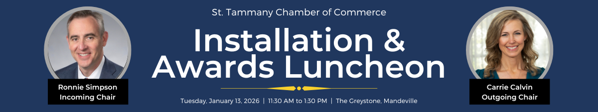 Join us as we kick off the new year by celebrating leadership, service and the people who make St. Tammany thrive. Our 2026 Installation & Awards Luncheon will be held on January 13 and brings together Chamber members, business leaders and community partners for an afternoon of recognition, inspiration and connection.