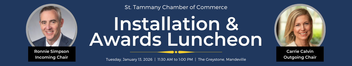 Join us as we kick off the new year by celebrating leadership, service and the people who make St. Tammany thrive. Our 2026 Installation & Awards Luncheon will be held on January 13 and brings together Chamber members, business leaders and community partners for an afternoon of recognition, inspiration and connection.